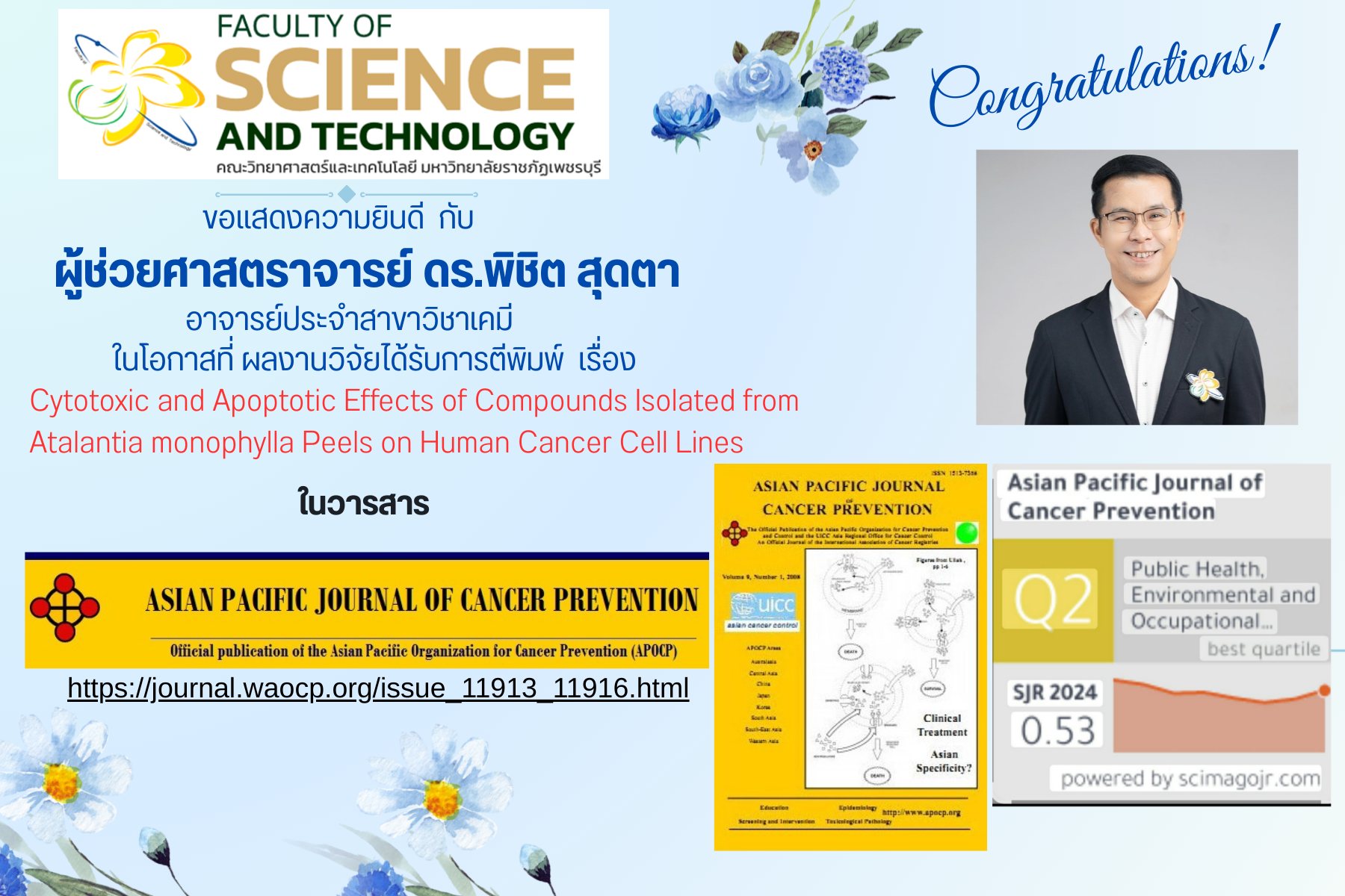 คณะวิทยาศาสตร์และเทคโนโลยี ขอแสดงความยินดีกับ ผู้ช่วยศาสตราจารย์ ดร.พิชิต สุดตา อาจารประจำสาขาวิชาเคมี เนื่องในโอกาสผลงานวิจัยได้รับการตีพิมพ์ ในวารสาร ASIAN PACIFIC JOURNAL OF CANCER PRVENTION