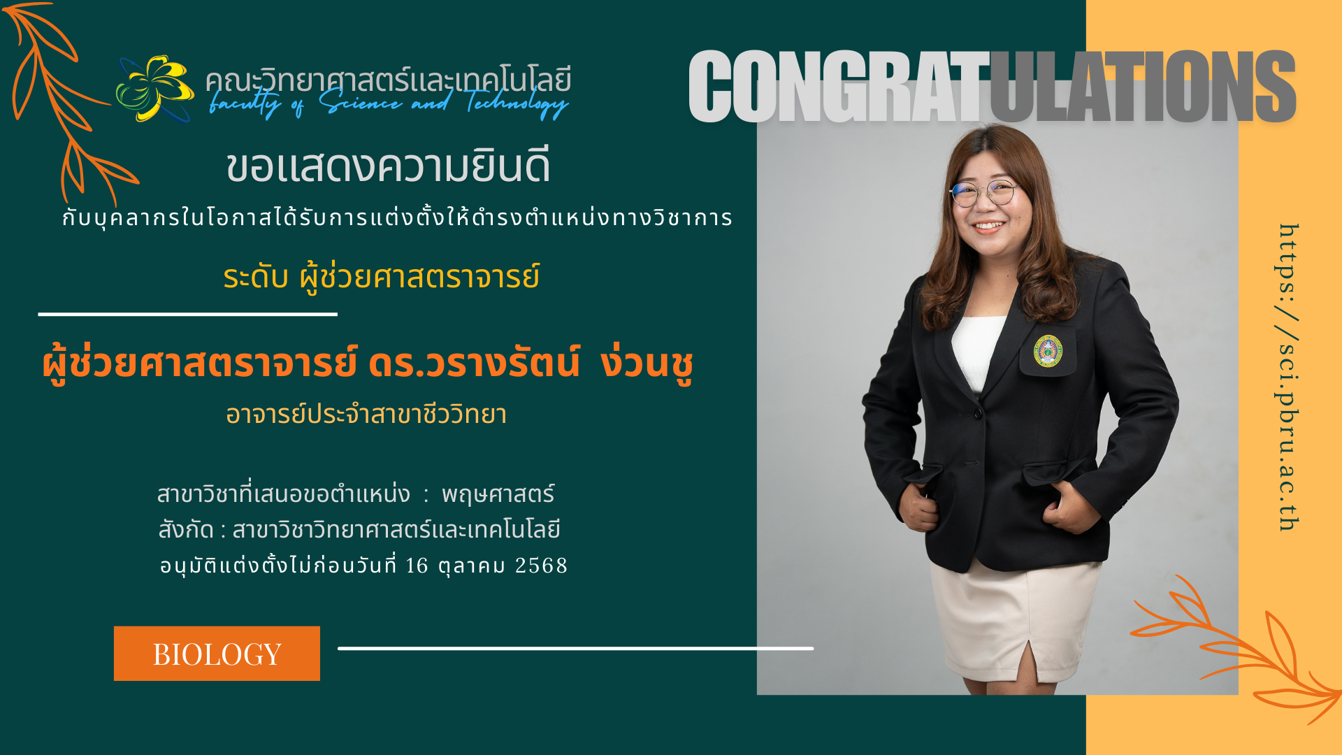 รายละเอียดกิจกรรม คณะวิทยาศาสตร์และเทคโนโลยี ขอแสดงความยินดี กับผู้ช่วยศาสตราจารย์ ดร.วรางรัตน์ ง่วนชู อาจารย์ประจำสาขาวิชา ชีววิทยา เนื่องในโอกาสได้รับการแต่งตั้งให้ดำรงดำแหน่งทางวิชาการ ระดับผู้ช่วยศาสตราจารย์ Share 0 FacebookTwitterLINEEmail