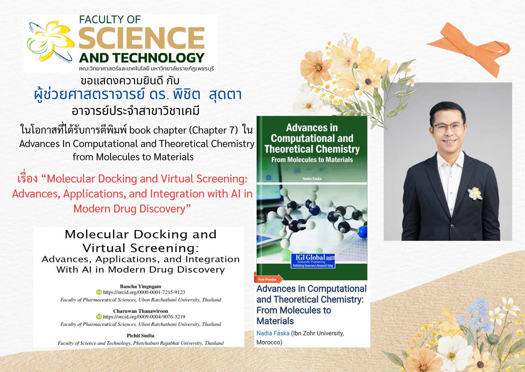 คณะวิทยาศาสตร์และเทคโนโลยี มหาวิทยาลัยราชภํกเพชรบุรี  ขอแสดงความยินดีกับ ผู้ช่วยศาสตราจารย์ ดร.พิชิต สุดตา อาจารย์ประจำสาขาวิชา เคมี เนื่องในโอกาสที่ผลงานวิจัยได้รับการตีพิมพ์ book (chapter 7) ในวารสาร Advance In Computational and Theoretical Chemistry from Molecules to Materials  เรื่อง “Molecular Docking and Virtual Screening : Advances,Applications, and Integration with AI in Modren Durg Discovery”