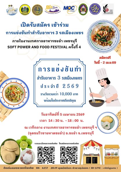 เมื่อวันที่ 5 เมษายน 2569 อาจารย์ศจีมาศ นันตสุคนธ์ ผู้ช่วยคณบดีฝ่ายโรงเรียนการอาหารนานาชาติเพชรบุรี ได้ส่งนักศึกษาสาขาวิชาเทคโนโลยีและศิลปะการประกอบอาหาร ชั้นปีที่ 2 คณะวิทยาศาสตร์และเทคโนโลยี (ทีม 3 ซ่า) และบุคลากรห้องอาหารเลอเพชร (ทีมเลอเพชร) เข้าร่วมการแข่งขันการทำอาหาร สำรับอาหาร 3 รสเมืองเพชร ณ จุดชมวิว ชะอำ ในงานเทศกาลอาหารชะอำ เพชรบุรี ผลงานแข่งขันมีดังนี้  ทีมเลอเพชร (บุคลากรห้องอาหารเลอเพชรโรงเรียนการอาหารนานาชาติเพชรบุรี) ได้รับรางวัลชนะเลิศ ด้วยเมนู 1.แกงป่าเนื้อเมืองเพชร 2.ยำชะครามถ้วย 3.ขนมอำพันโตนด และ ทีม 3 ซ่า (นักศึกษาสาขาวิชาเทคโนโลยีและศิลปะการประกอบอาหาร ชั้นปีที่ 2) ได้รับรางวัลรองชนะเลิศอันดับ 2 ด้วยเมนู 1. ผัดไอ้คุ้ยเนื้อ 2. ต้มสีนวลปลากระพงไหลบัว 3. ขนมชะคราม ประกอบด้วย